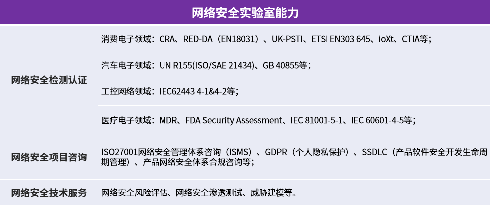 信测标准网络安全实验室位于深圳市南山区信测标准南山检测基地,属于信测标准网络安全产线下属单位,实验室由拥有多年网络安全经验的网络安全专家及项目经验丰富的测试工程师组成,依据ISO 17025标准建设,具备符合资质要求的标准化环境、设备、人员及流程。目前已具备智能消费电子(含无线电设备)、汽车及汽车电子、医疗电子、工业控制网络等四大垂直领域的产品网络安全检测与认证能力,同时还具备半导体、物联网设备制造企业的OT端网络安全体系项目咨询、安全技术服务等相关业务的能力。