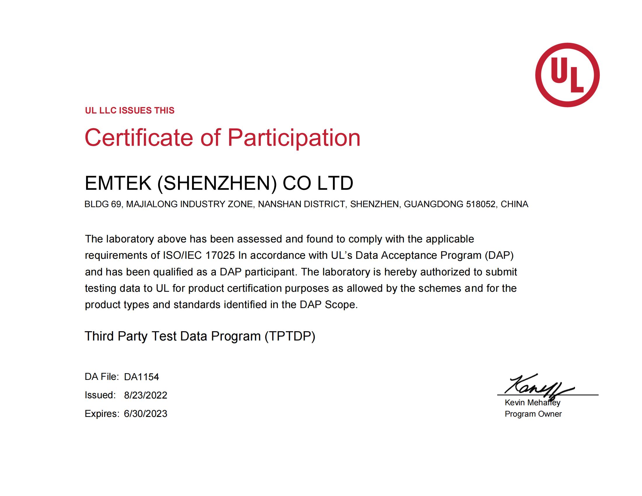 TPTDP表明在其授权范围内信测标准可以独立开展测试,UL将以信测标准产生的测试数据为依据颁发证书。