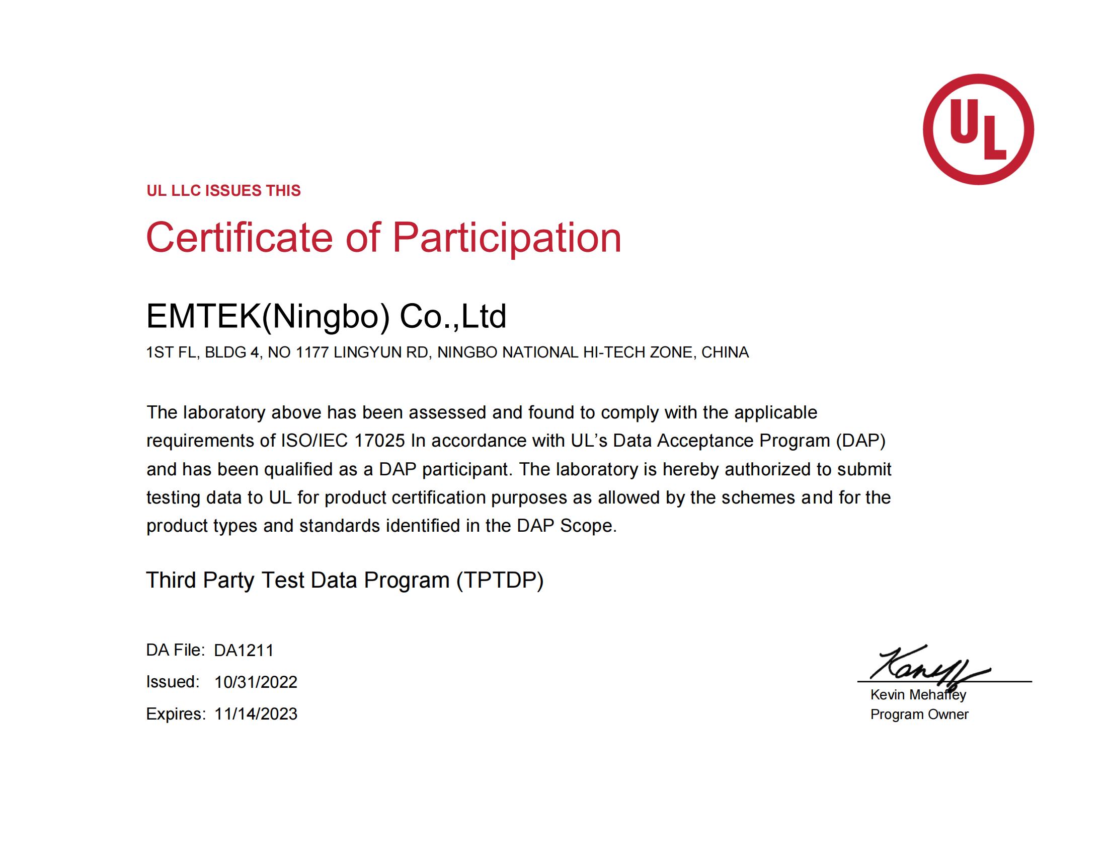 近日,宁波市信测检测技术有限公司顺利通过UL-CAP复评审,收到美国UL公司签发TPTDP资质续期证书。