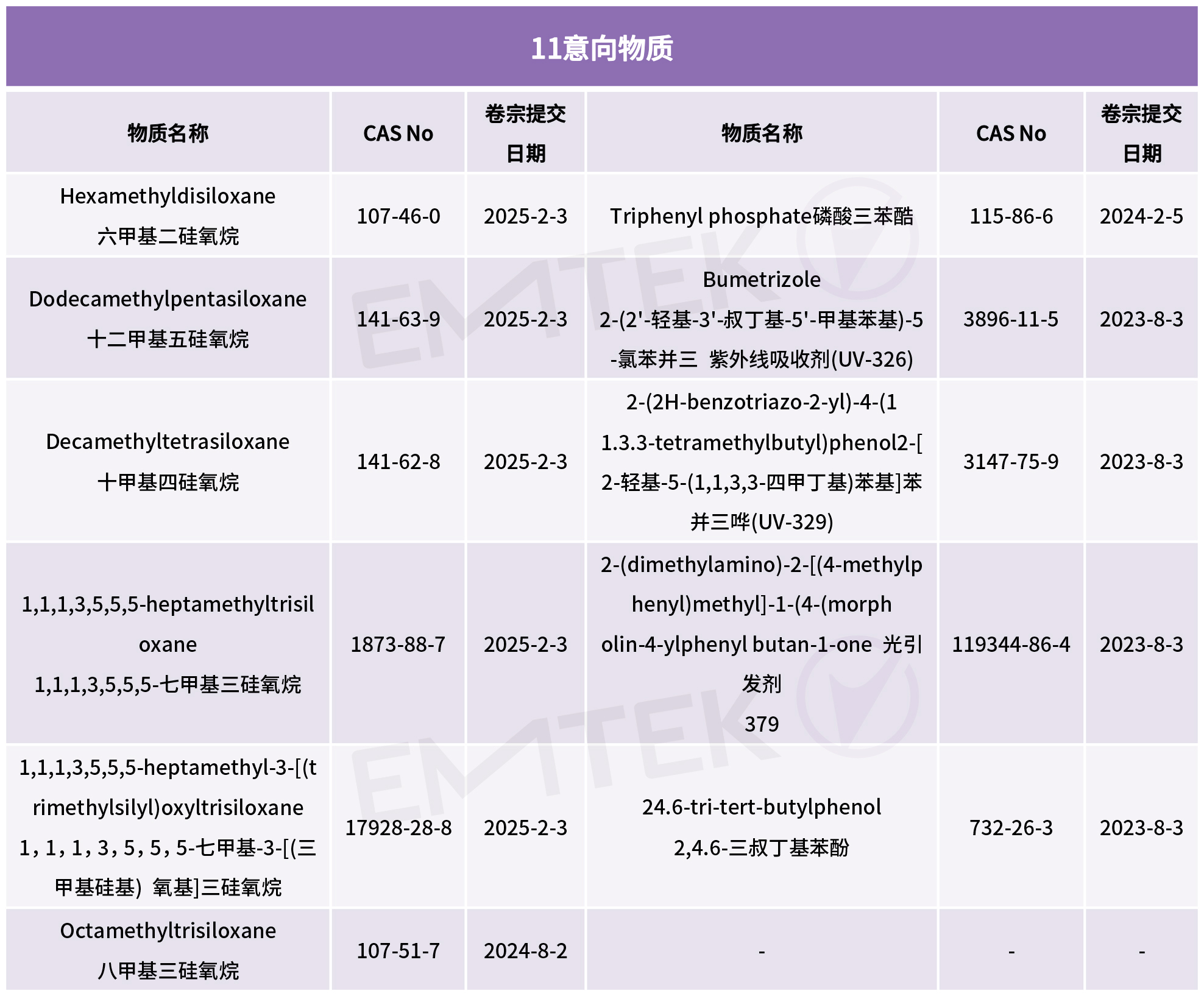近期,挪威,法国,德国,奥地利和比利时分别于今年的3月及6月提交了共11项SVHC意向物质,目前这11项意向物质都还处在“提议方准备相关物质的卷宗”阶段,卷宗提交时间最早的是预计2023年8月3日提交的4项,其它7项分别预计要2024或2025年提交。这些意向物质离正式成为SVHC候选清单物质还需要经过卷宗提交—公众咨询—欧委会最终决议等流程。一般ECHA收到提案卷宗后的一个月左右会进行公布,并启动为期45天的公众评议,通过评议的物质将被加入SVHC候选物质清单。
