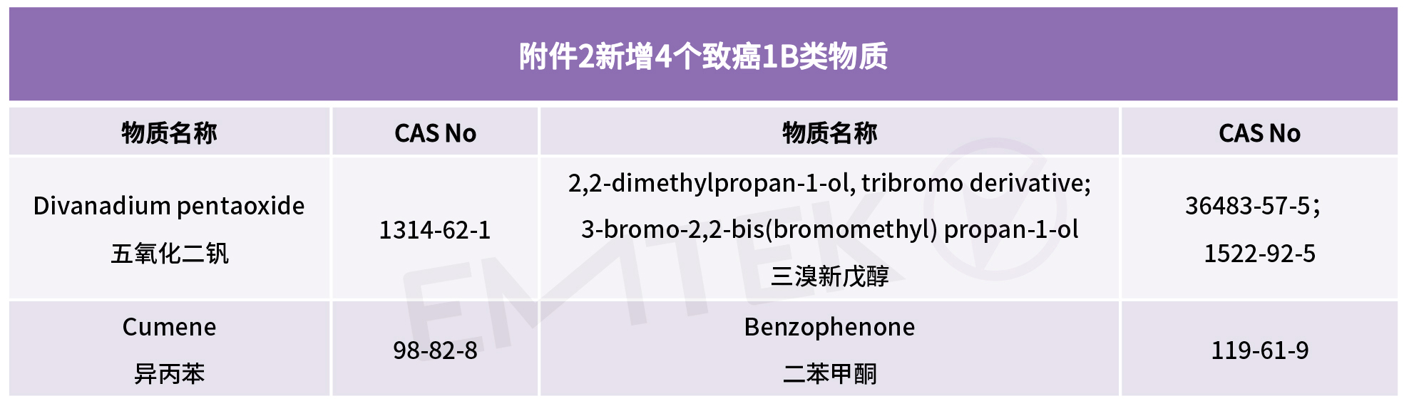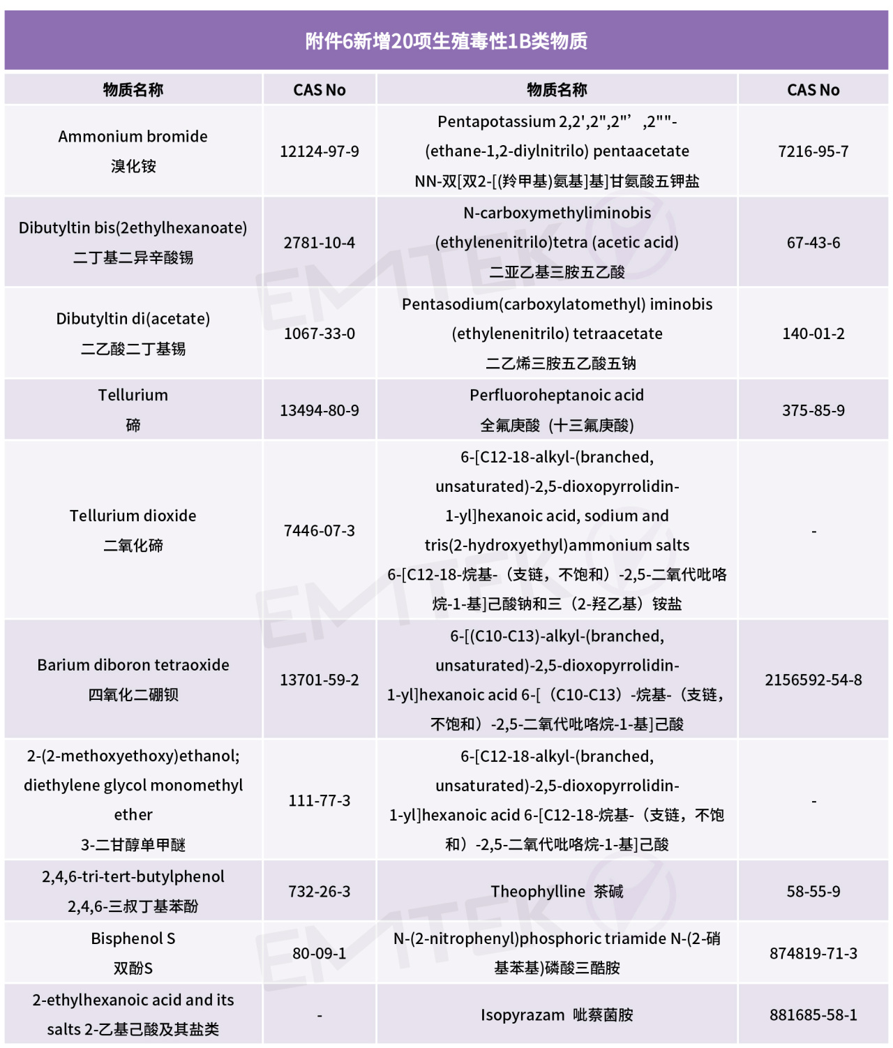 此次修订,新增24项CMR物质,新增物质将于2023年12月1号生效,同时,针对之前的5项CMR物质信息进行了更新,具体新增物质如下: