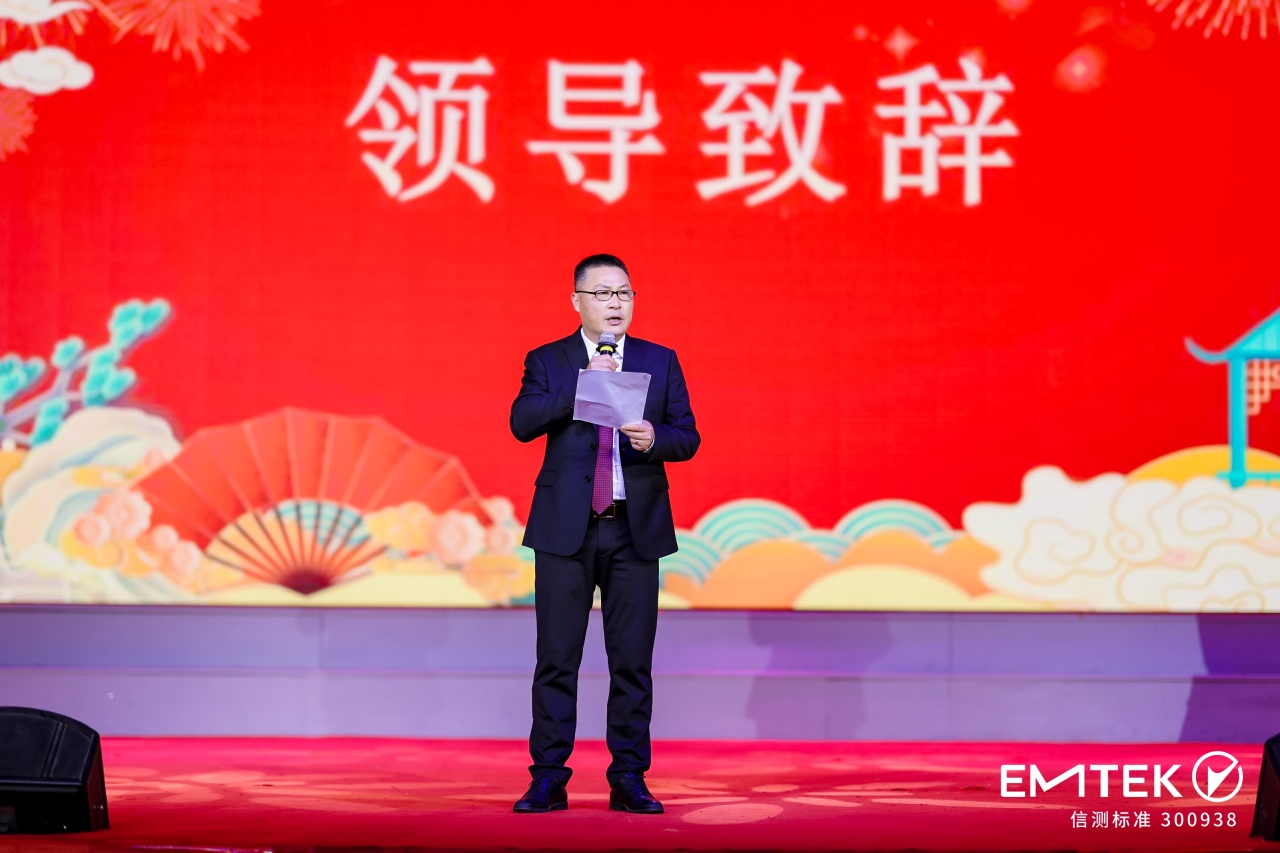 随后,信测标准董事长吕杰中先生上台致辞。吕杰中董事长对所有员工过去这一年的辛勤付出与奉献表示最诚挚的感谢。他回顾了过去一年来信测发展的重要事件及取得的成就并提出了新的一年的发展目标和期望,鼓励员工们以公司发展战略和经营目标为导向,以战略的思维、全面的眼光审视市场格局,以务实稳健的态度、坚定不移的信心开拓进取,实现2024新的破局。