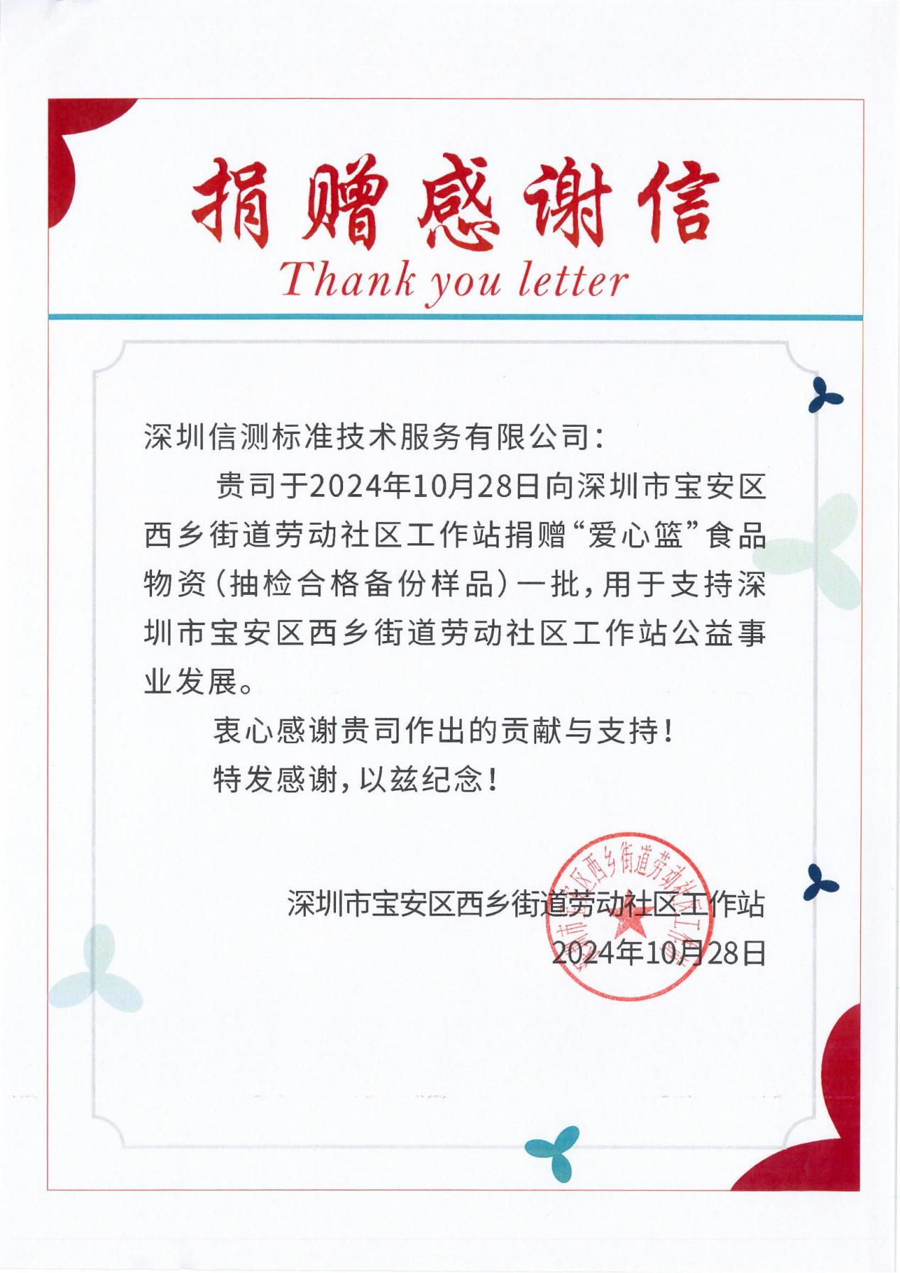 深圳市宝安区西乡街道劳动社区工作站为深表谢意,特向信测标准颁发了感谢信,以此作为对信测标准慷慨捐赠的崇高敬意。