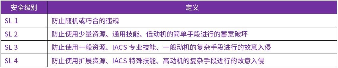 以上每个安全大类均定义了多个CR和RE(增强)来映射到不同的安全级别SL中,安全级别越高,安全需求要求也越高。IEC 62443-4-2中定义了四种安全级别SL,如下: