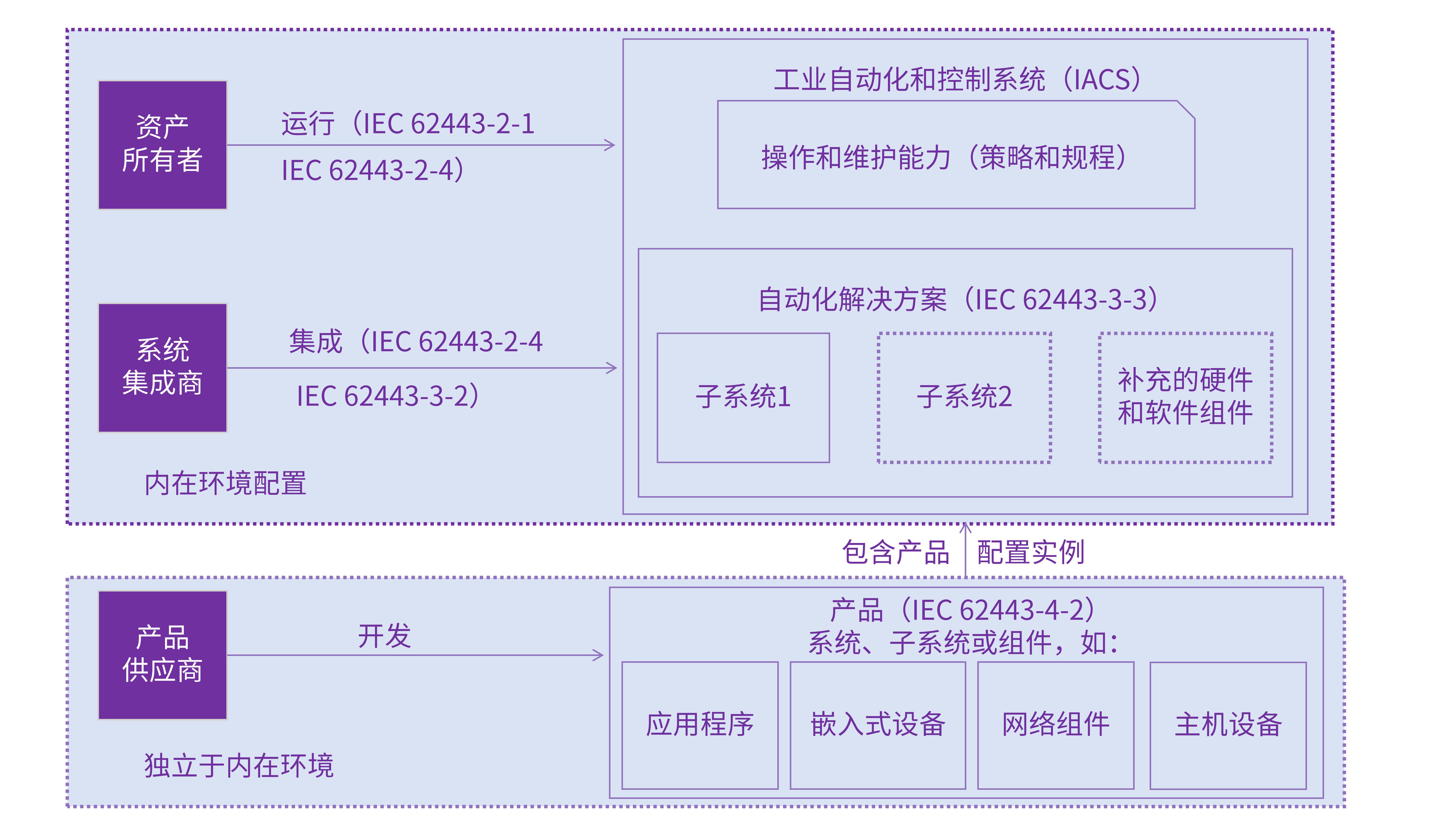 (1) 资产所有者。可以采用的子标准包括: IEC 62443-2-1,IEC 62443-2-3,IEC 62443-2-4,IEC 62443-3-2,IEC 62443-3-3。