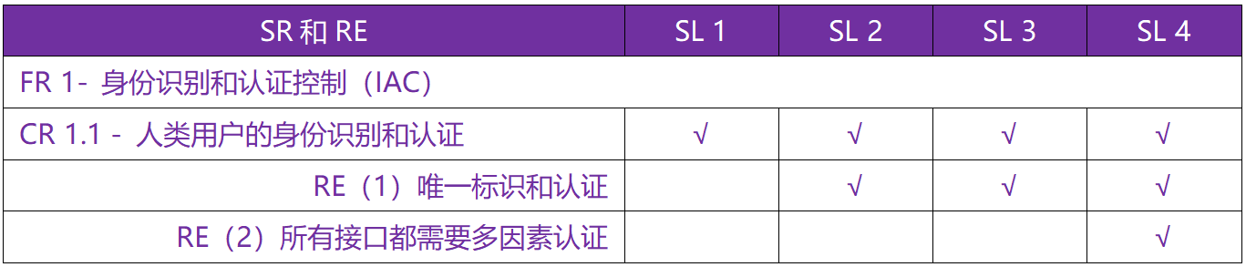 上面截图所示,当要达到安全级别3级,需要同时满足CR 1.1、RE(1)的要求。当要达到安全级别4级,需要同时满足CR 1.1、RE(1)、RE(2)的要求。