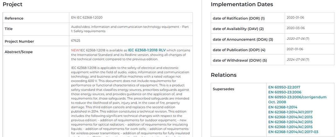 根据CENELEC官网显示,EN 62368-1:2014(第二版)的DOW(Date Of Withdrawn)是2023年1月6日,从这天起,EN 62368-1:2014(第二版)将被撤销,同时EN IEC 62368-1:2020(第三版) 被强制执行。由于第二版很可能在该日期之后的一段时间内继续在欧盟官方期刊(EUOJ)中被引用,因此将会出现第二版已经被撤销,但仍然是LVD低电压指令的协调标准的状况。