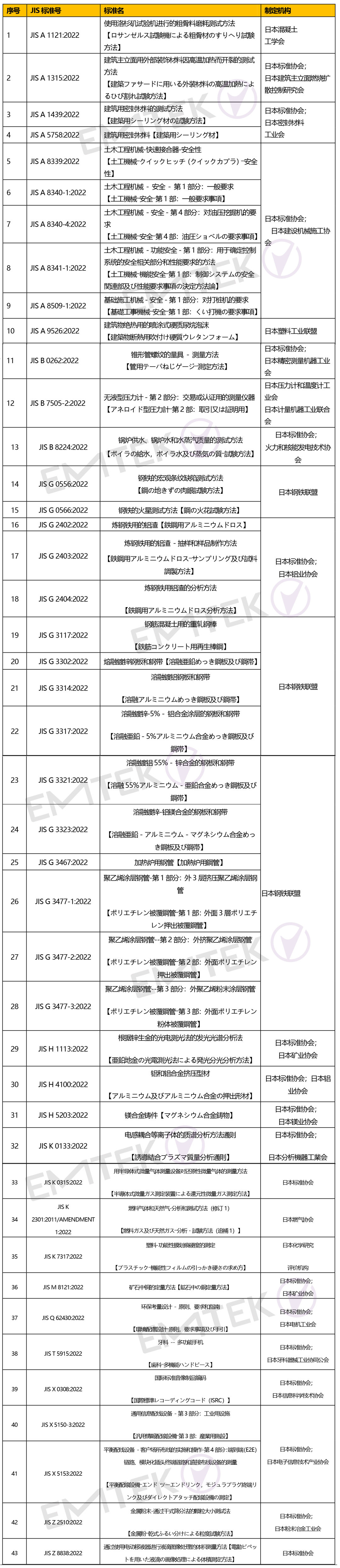 2022 年12 月消息,日本标准协会(JSA)公布了2022 年12 月新制定的标准一览表如下: