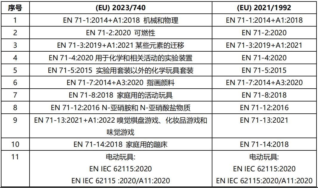 2023 年 4 月 5 日,欧盟(EU)发布了委员会执行决定(EU)2023/740,其中包括证明推定符合指令2009/48/EC 的最新玩具安全标准清单(玩具安全指令--合并版本至 2022 年 12 月)。这套最新标准将 EN 71-13:2021 修订为 EN 71-13:2021+A1:2022,适用于嗅觉棋盘游戏、化妆品套装和味觉游戏,以反映关于过敏性香料的(EU) 2020/2088 和(EU) 2020/2089 号指令。
