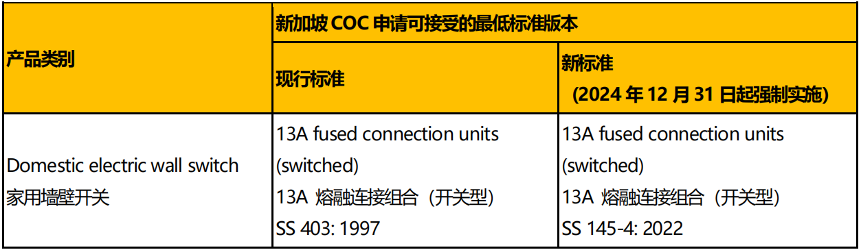 2023 年3 月31 日,新加坡消费品安全办公室(CPSO)发布通告CPSO-310323-08, 对《消费者保护(安全要求)条例》(CPSR)列出的13A 熔融连接组合(开关型)的安全标准进行了最新修订,自2024 年12 月31 日起,新加坡安规申请接受的最低安全标准版本为SS 145-4: 2022。