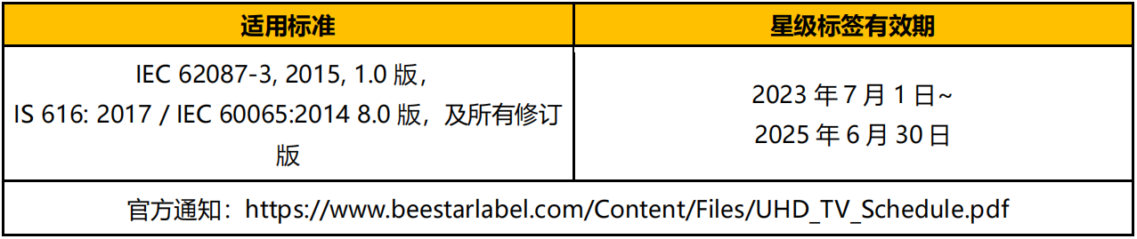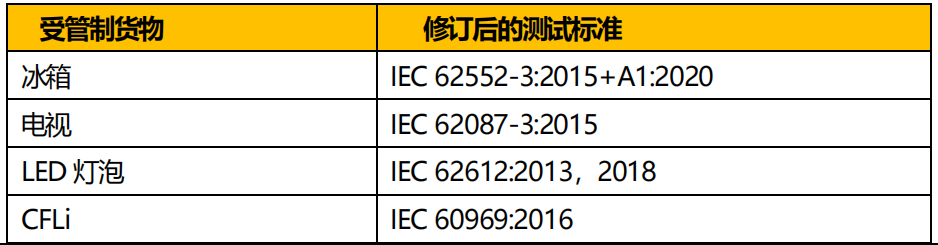 自2024 年1 月1 日起,冰箱,电视机,LED 灯泡,CFLi 的现行测试标准将被下列适用新标准所取代,如下表所示。生效日之后,所涉及的受管制货物的新注册和续期注册,应按照修订后的测试标准进行测试: