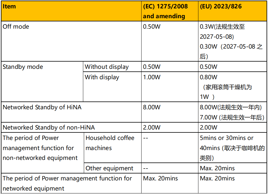 2023 年 4 月 17 日,针对 off mode, standby mode, and networked standby mode 相关的要求,欧盟委员会公告了新指令(EU) 2023/826,以减少电器设备处在 off mode, standby mode, and networked standby mode 的能耗;同时废除了简易机顶盒生态设计指令(EC) No 107/2009 及电子电器 off mode, standby mode, and networked standby mode 生态设计指令(EC) No 1275/2008。