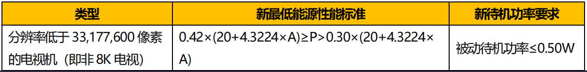 自2024年4月1日起,所有在新加坡销售的分辨率低于33,177,600像素的电视机(即非8K电视)须满足新的MEPS(新的最低能源性能标准)要求如下表: