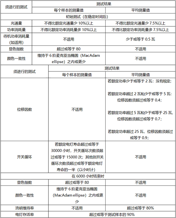 15.6.1、在依据条例第6 条向署长呈交的测试报告中,根据CIE 84、IEC 62612、IEC 62301 或署长批准的其他同等国际标准进行测试的结果必须显示有关型号的发光二极管灯符合以下表现规定——