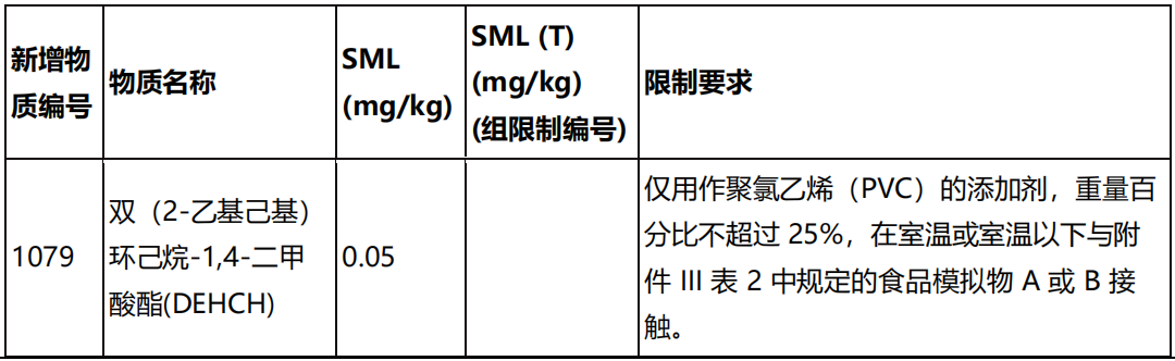 2023 年 8 月 11 日,欧盟委员会在其官方公报发布修订案(EU)2023/1627,以修订食品接触材料塑料法规(EU)10/2011 附件 I,新增 1,4-环己烷二羧酸二异辛酯(DEHCH)的授权。该修订案将于2023年8月31 日生效。
