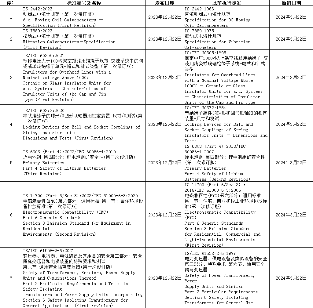 2023 年 12 月 27 日,印度标准局修订并发布电流计、锂电池、变压器等 7 项标准,修订后标准自发布之日起正式生效,此前执行标准将于 2024 年 3 月 22 日撤销,具体修订情况如下。
