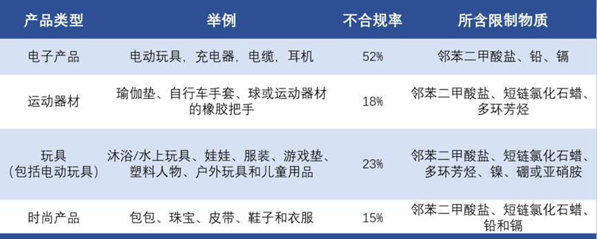 3.物品的不合规率为 20%,其中最不合规的产品类型是电子产品(52%),主要是由于含有邻苯二甲酸盐、铅、镉和短链氯化石蜡等限制物质导致的。