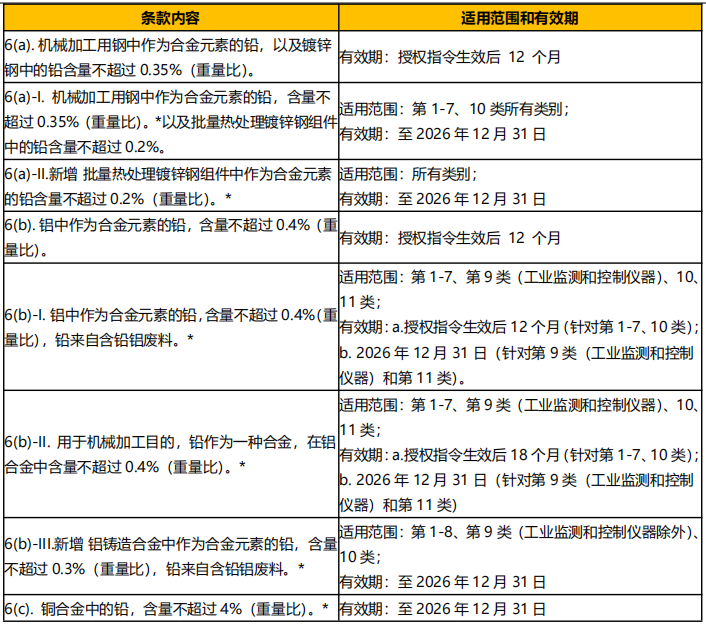 针对钢合金、铝合金、铜合金中的铅豁免,草案拟更新附件 III 中第 6(a)、6(a)- I、6(b)、6(b)- I、6(b)- II和 6(c)项条款。