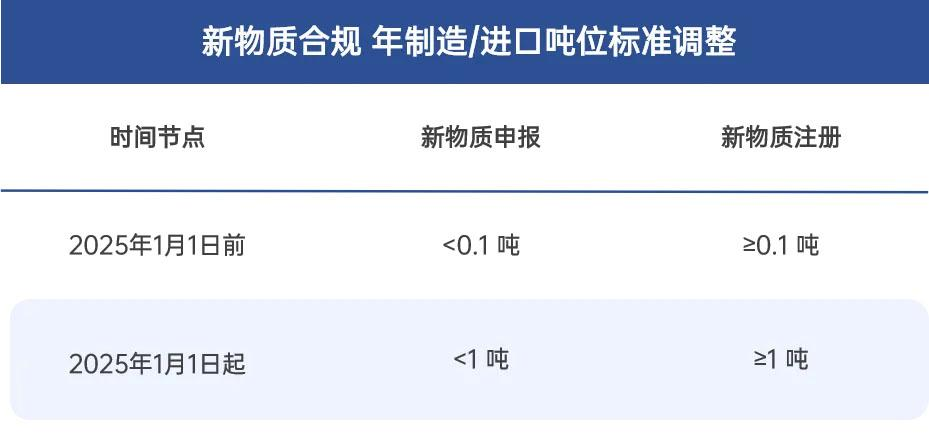 涉及申报吨位调整(0.1 吨→1 吨)和分类标识证明依据的事项,自 2025 年 1 月 1 日起执行,涉及官方有害性审查和信息公开的事项,自同年 8 月 7 日起执行。