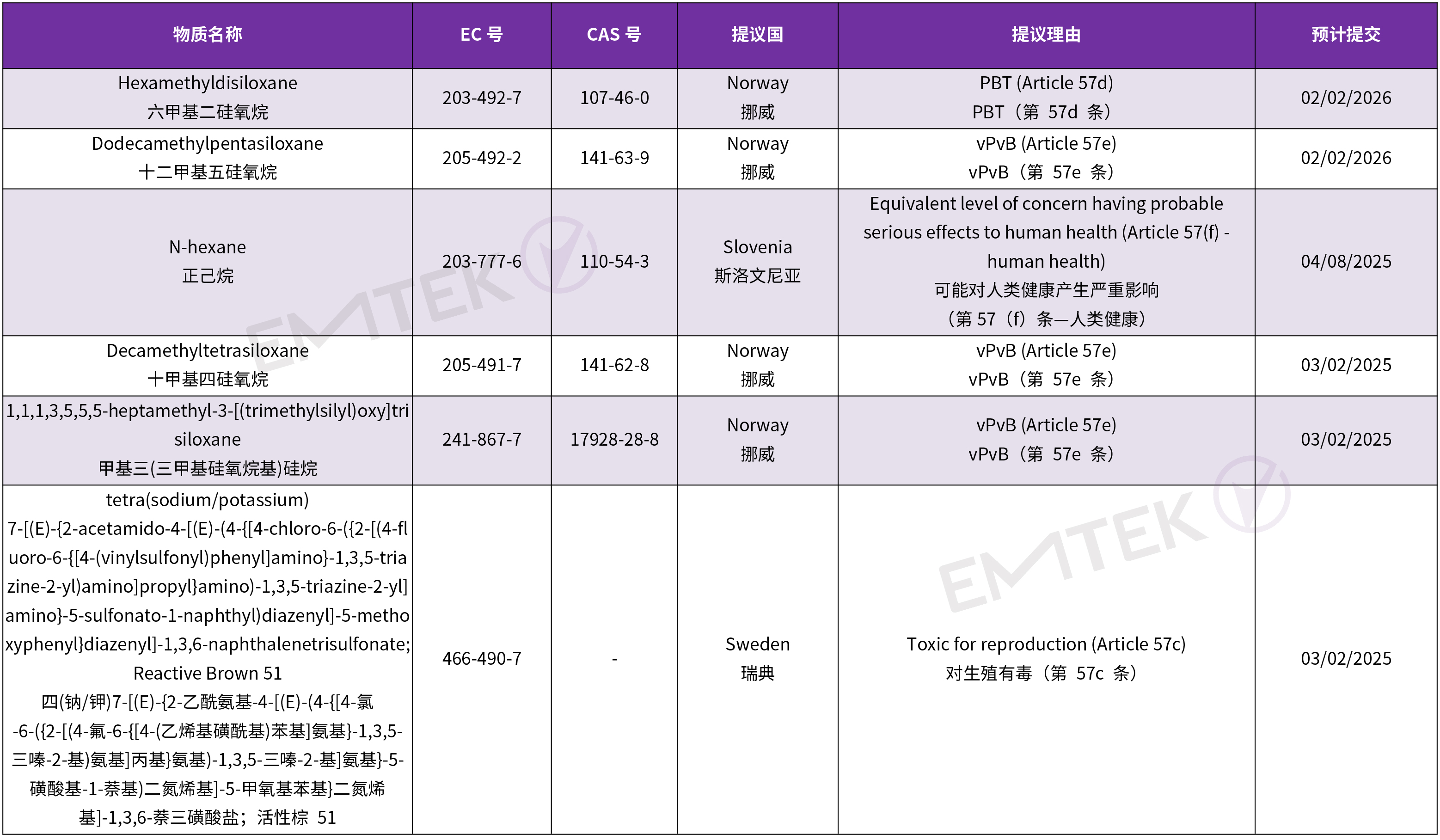 2025年2月18日,欧盟化学品管理局(ECHA)发布1项新的SVHC意向物质——正己烷。预计2025年8月4日前提交相关反馈意见,如反馈意见评议通过,将被正式加入SVHC候选物质清单。截止目前,SVHC 物质清单含括: 247项正式物质,1项(间苯二酚)待决物质,6项意向物质。