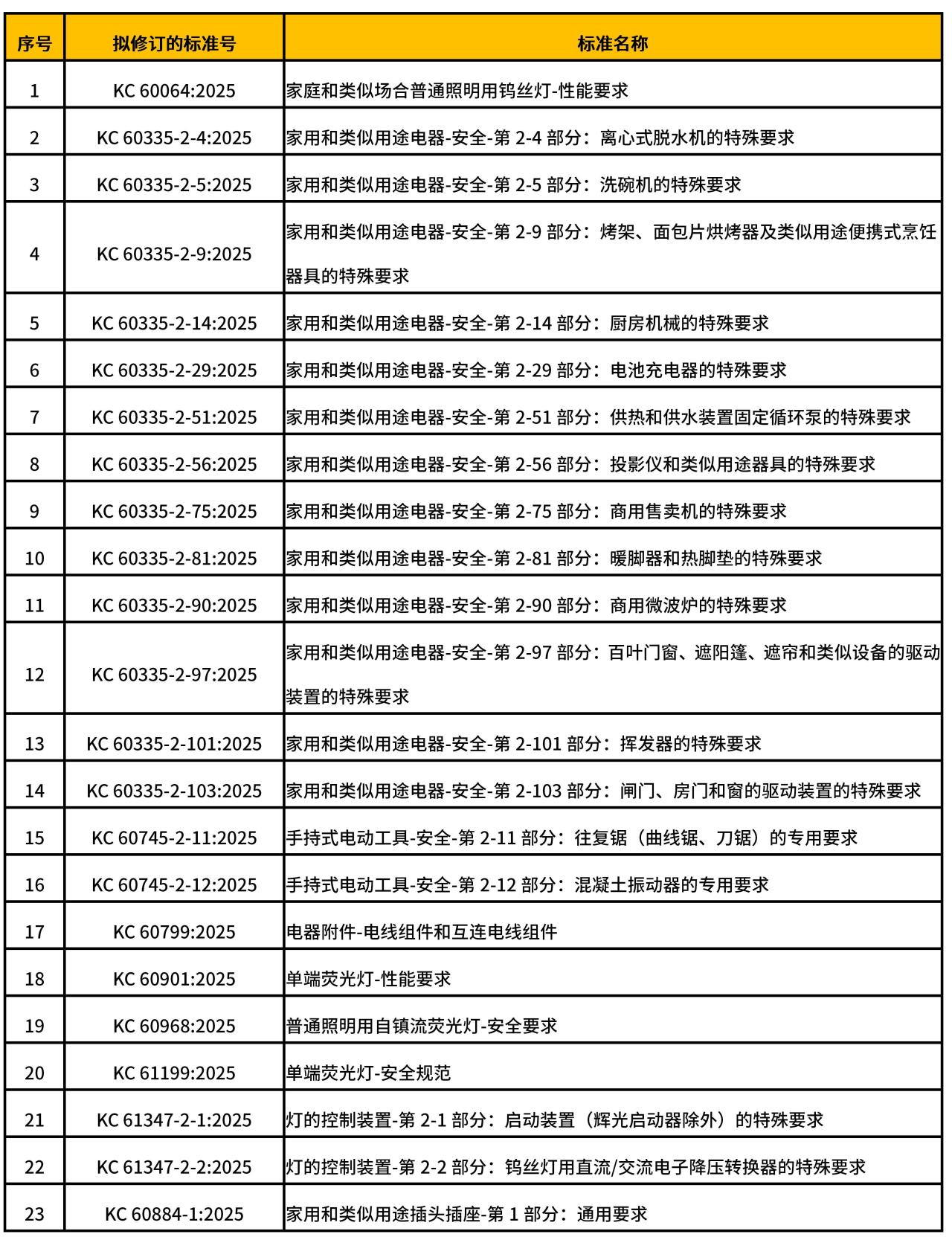 本次修订范围广泛,涵盖了 KC 系列标准中的 23 个重要类别,见表 1,包括 KC 60332 系列、KC 60745系列等多个关键电器安全标准。修订内容主要集中在三个方面:一是对技术要求进行更新,重点改进产品材料、结构和安全性能指标;二是对测试方法进行优化和补充,确保评估更加准确;三是针对特定产品的分类和适用范围进行调整,使标准更具针对性。