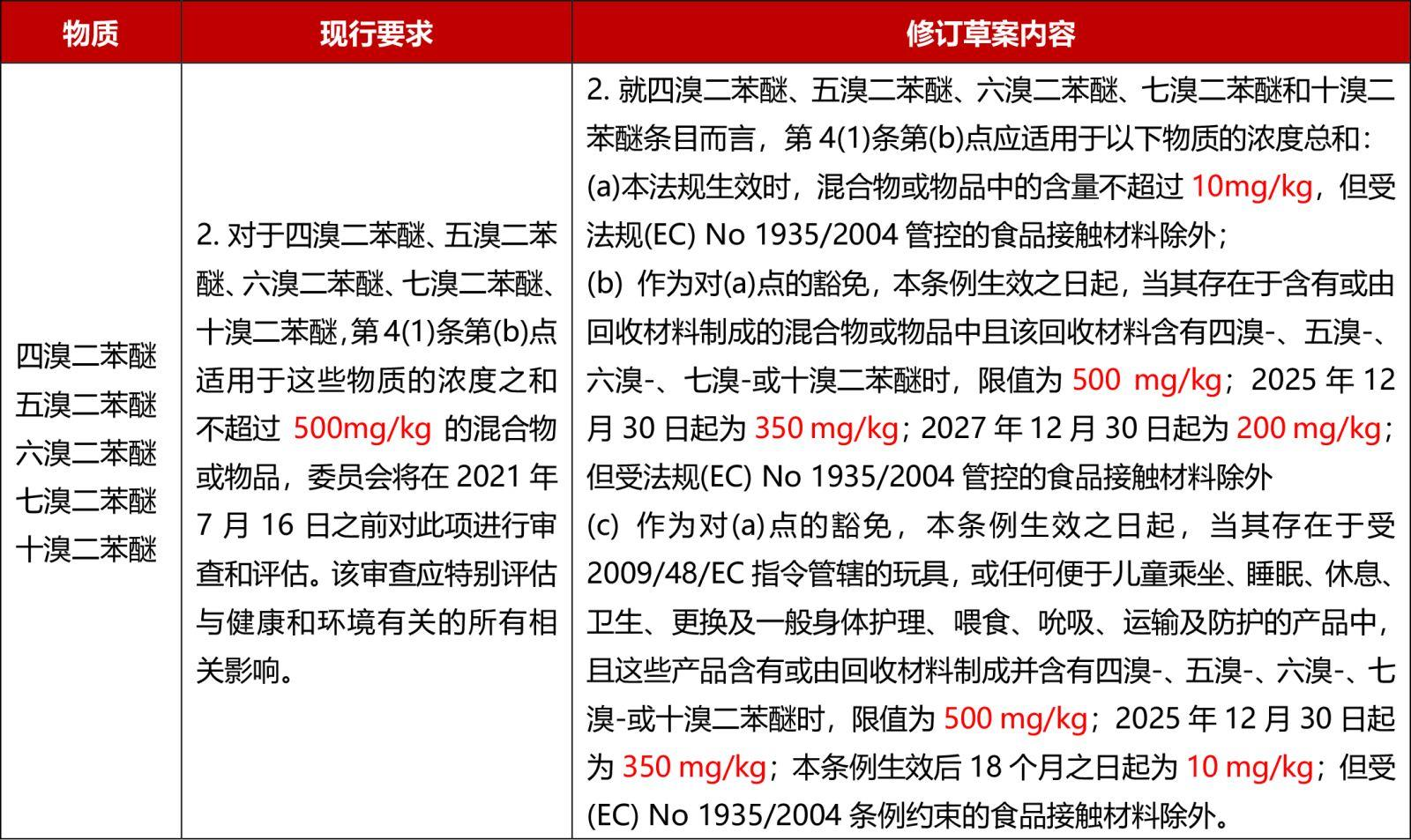 2025 年 7 月 24 日,欧盟委员会批准一项授权草案 C(2025)4797,修订欧盟持久性有机污染物(POPs)法规(EU) 2019/1021,拟进一步收紧 POPs 法规附录 I 的 A 部分中多溴二苯醚(PBDEs)的限值要求。该草案将发布于欧盟官方公报(OJEU)上,并自其在欧盟官方公报公布之日起第 20 天生效。