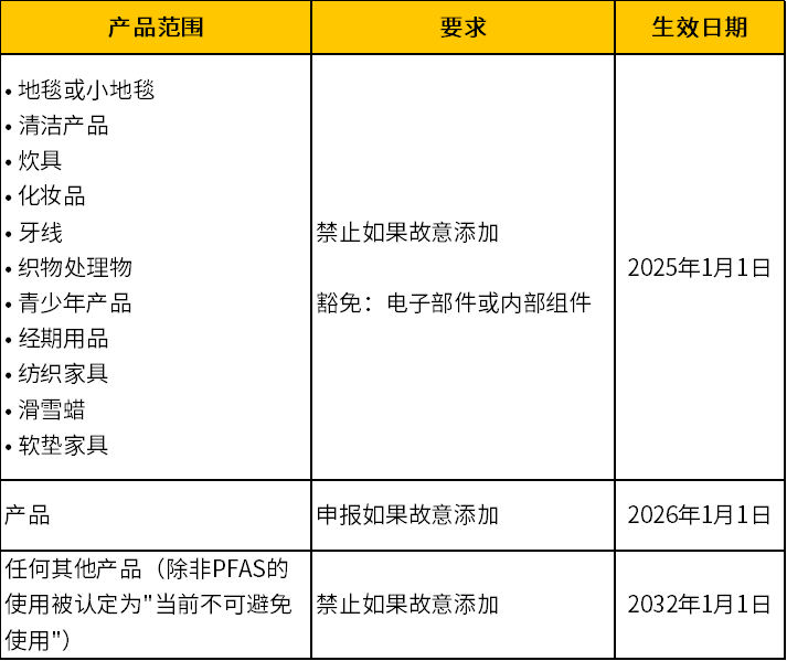 • 修订第 6 点:允许在移动和固定系统中已安装的用于液体燃料蒸汽抑制和 B 类液体燃料火灾的含全氟辛酸(PFOA)及其盐类和相关化合物的灭火泡沫(FFF)的使用期限从“直至 2025 年 7 月 4 日”推迟五个月至“直至 2025 年 12 月 3 日”。