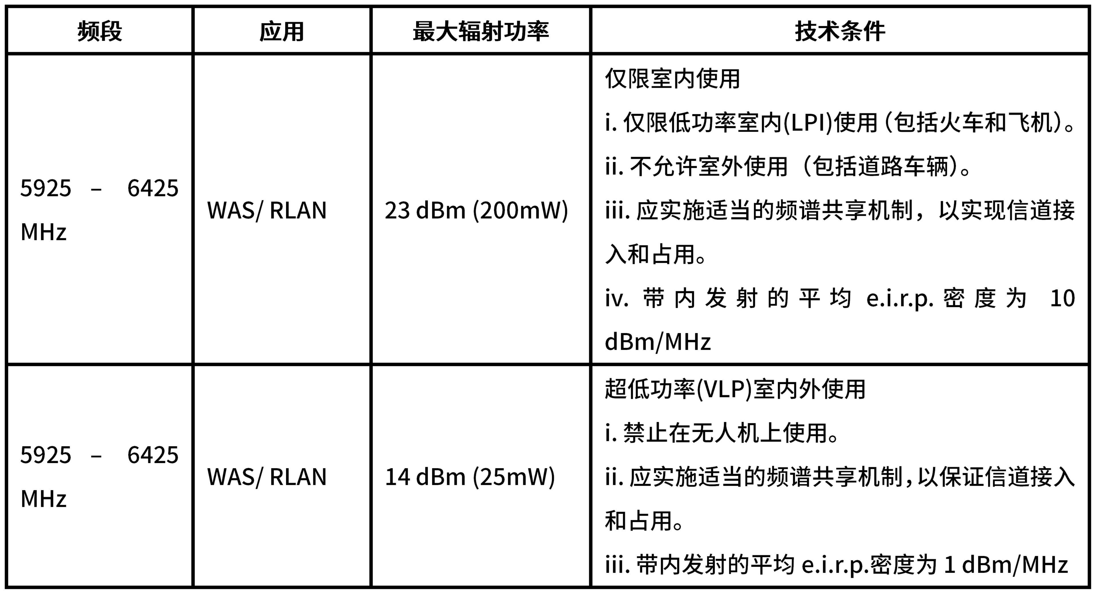 1. 根据该决议,现5945–6425 MHz频段已经正式开放,附带以下使用条件: