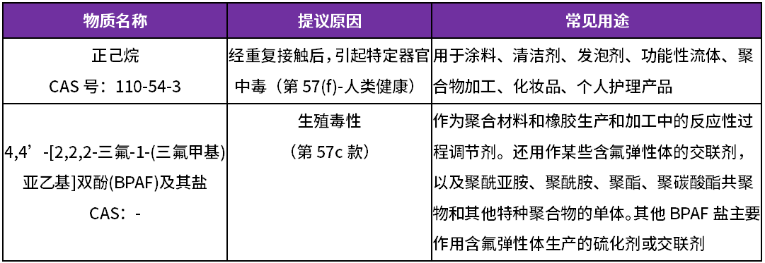 2025年12月15日,欧洲化学品管理局(ECHA)成员国委员会(MSC)12月会议一致同意将正己烷(n-hexane)列为高度关注物质(SVHC),这是首个因神经毒性(而非致癌、致突变、生殖毒性等传统类别)而被认定为列入SVHC候选清单的物质。另外, 4,4'-[2,2,2-三氟-1-(三氟甲基)亚乙基]双酚(BPAF)及其盐在未经委员会讨论的情况下被一并列入SVHC候选清单。ECHA计划于2026年2月将这2项物质列入SVHC清单,届时REACH SVHC清单将正式增至253项。