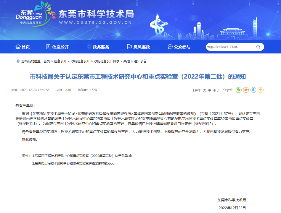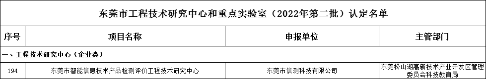 近日,东莞市科学技术局发布《市科技局关于认定东莞市工程技术研究中心和重点实验室(2022年第二批)的通知》,东莞市信测科技有限公司申报的东莞市智能信息技术产品检测评价工程技术研究中心被正式认定为东莞市工程技术研究中心。