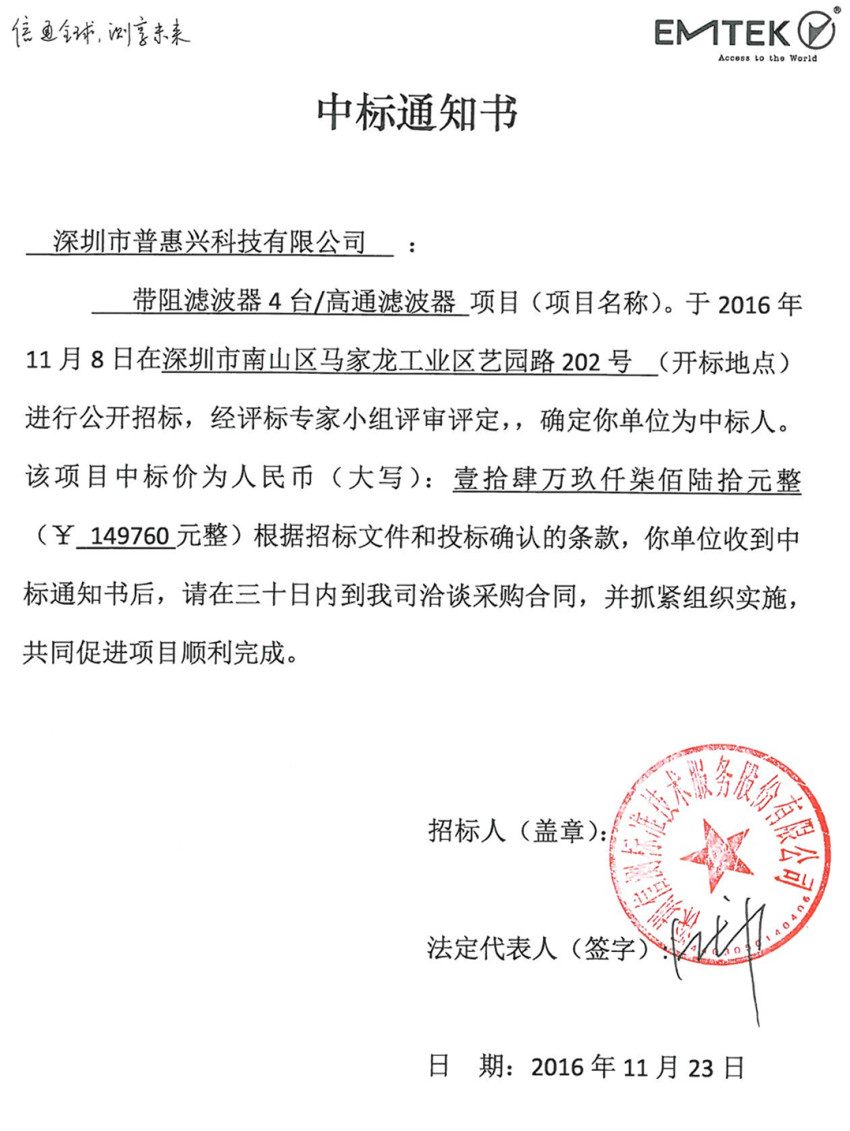 普惠兴中标通知书